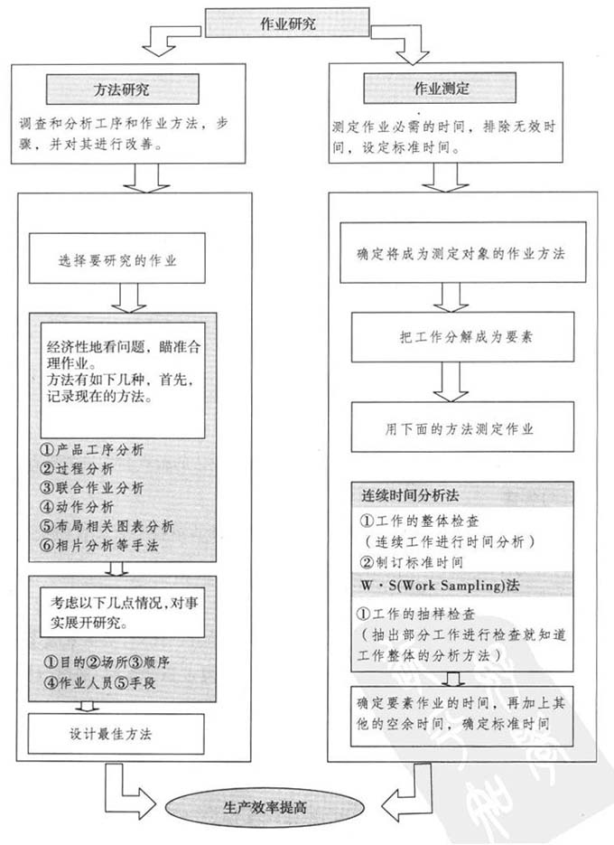 以時(shí)間為尺度將作業(yè)系統(tǒng)和構(gòu)成要素的工作數(shù)值化,以改善和維持為目標(biāo)。大致分為連續(xù)時(shí)間分析法和W.S(工作抽樣:work sampling)法。