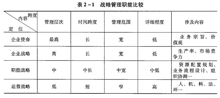 從企業(yè)投入產(chǎn)出的角度看,任何一個(gè)企業(yè)的生產(chǎn)運(yùn)營系統(tǒng)都可以用流程(過程)描述其功能。這個(gè)流程可以是一個(gè),也可以是一系列組成。例如,中國石化雖然是一個(gè)龐大而復(fù)雜的生產(chǎn)運(yùn)營系統(tǒng),但從其上下游一體化的業(yè)務(wù)流程看,從油氣田的勘探開發(fā),到煉油和油氣的深加工.再到產(chǎn)品的銷售,就是要素投入、產(chǎn)出和一系列轉(zhuǎn)化的業(yè)務(wù)過程。那么如何定量定性地分析和評價(jià)一個(gè)業(yè)務(wù)流程的品質(zhì),載體就是流程單元。將戰(zhàn)略管理視為一個(gè)流程,流程單元就是不同層次的戰(zhàn)略職能定位(圖2—1)。