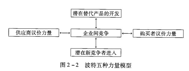 外部環(huán)境因素分析可以分為一般環(huán)境分析和行業(yè)環(huán)境分析。一般環(huán)境分析側(cè)重宏觀環(huán)境或社會(huì)大環(huán)境,主要包括可能影響企業(yè)的經(jīng)濟(jì)環(huán)境、政治和法律環(huán)境、社會(huì)文化環(huán)境、科技環(huán)境、全球化環(huán)境等五個(gè)方面。行業(yè)環(huán)境分析一般采用美國(guó)戰(zhàn)略管理專家波特的“五種力量模型”進(jìn)行競(jìng)爭(zhēng)強(qiáng)度分析,見圖2—2;實(shí)際上對(duì)企業(yè)戰(zhàn)略產(chǎn)生影響和制約作用的外部因素很多,但是進(jìn)行戰(zhàn)略分析時(shí)并不需要窮盡所有因素,相反只需要確認(rèn)那些關(guān)鍵的外部機(jī)會(huì)因素和潛在的威脅因素,使企業(yè)可以集中力量針對(duì)那些關(guān)鍵因素做出積極的反應(yīng)。