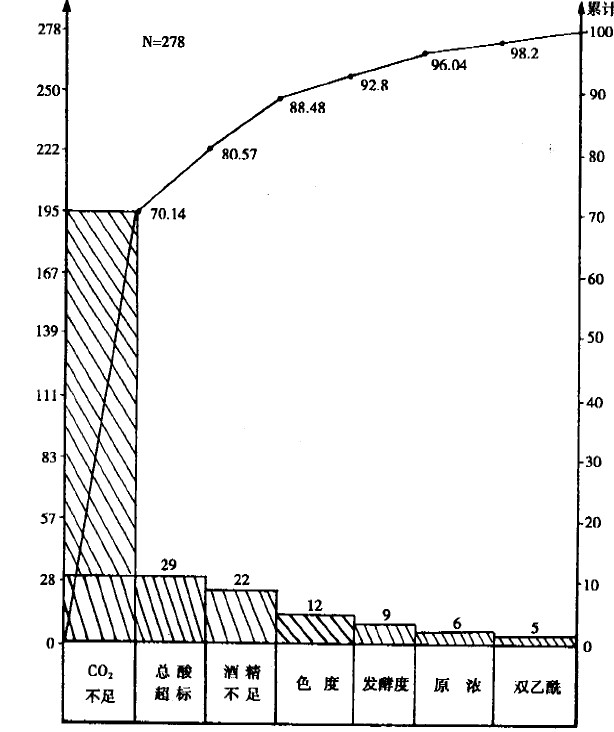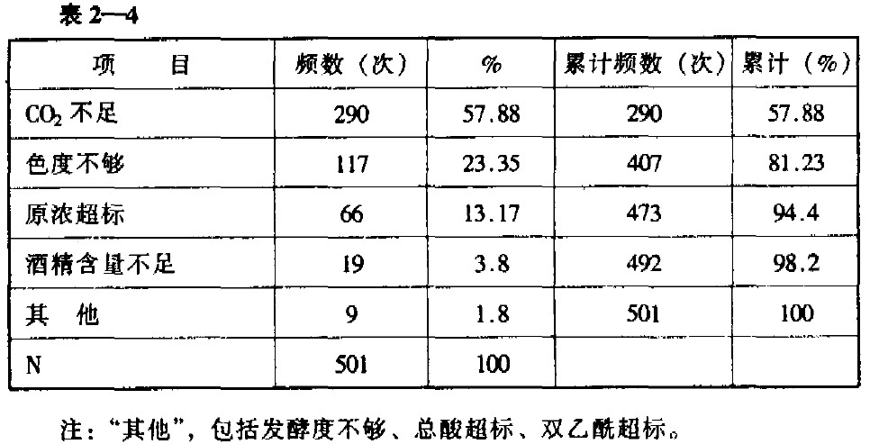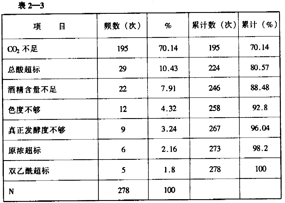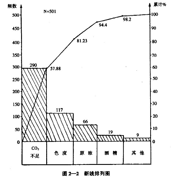 注:雙乙酰未全檢。將表中數(shù)據(jù)繪制成圖2-1的排列圖。