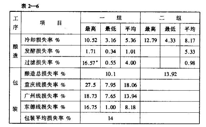 一季度該廠總損失率為27.5%,遠(yuǎn)遠(yuǎn)落后于全國平均水平和先進(jìn)水平。全國四十六家大、中型啤酒廠的啤酒總損失率平均為14.05%,廣州啤酒廠僅為5.53%,為全國先進(jìn)水平,共總損失率5.53%是在啤酒生產(chǎn)過程中不可避免損失的范圍內(nèi)。詳見表2-10。