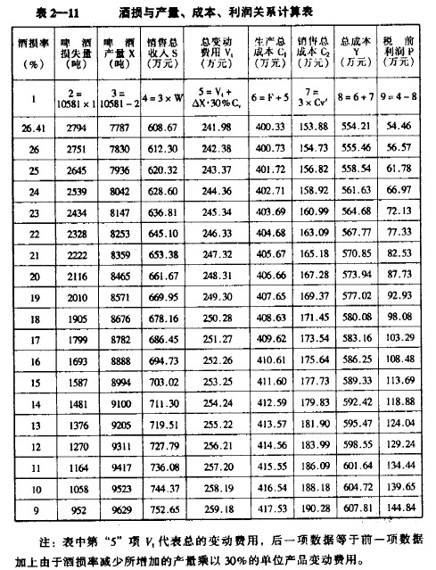 表2-11所計(jì)算的數(shù)字,是假設(shè)酒損率每下降一個(gè)百分點(diǎn),而市場平均售價(jià)、固定費(fèi)用、單位產(chǎn)品變動費(fèi)用、單位產(chǎn)品的銷售稅、銷售費(fèi)用和教育附加費(fèi)等不變的情況下,所引起的啤酒產(chǎn)量、 銷售收人、成本、利潤等指標(biāo)的變化。該廠1一6月份的酒損率為26.41%,啤酒損失量達(dá)2794噸,啤酒產(chǎn)量為7787噸,每噸啤酒的成本是711.71元,稅前利潤54.46萬元。若加強(qiáng)管理,能使酒損率降至本企業(yè)曾達(dá)到的較好水平13%,那么,在不增加任何投入的情況下,可增產(chǎn)啤酒1418噸,增長18.2%;每噸啤酒的成本為646.9元,下降9.1%;稅前利潤124.04萬元,增長1.28倍;假如再加把勁,使酒損率降到國家二級企業(yè)標(biāo)準(zhǔn)的9%,則可增產(chǎn)啤酒1842噸,增長23.65%;每噸啤酒成本為631.23元,下降11.3%;稅前利潤144.84萬元,增長1.66倍。,