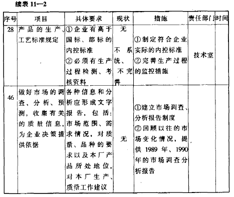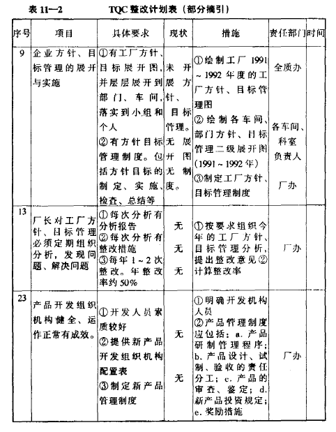 在這份整改計劃中,具體提出了工廠在推行全面質量管理中,應著手10個方面,共53項具體工作的內容,并與企業(yè)商定、落實了各項具體工作的執(zhí)行部門及要求。整個計劃以表格形式列出,直觀、具體、清楚,共計數(shù)十頁。限于篇幅,這里只把整改計劃中提出的10個方面的工作列出,并摘錄整改計劃表中的一些具體條目列于后,使讀者由此對整個全面質量管理整改計劃的全貌,可以有一個大致的了解。