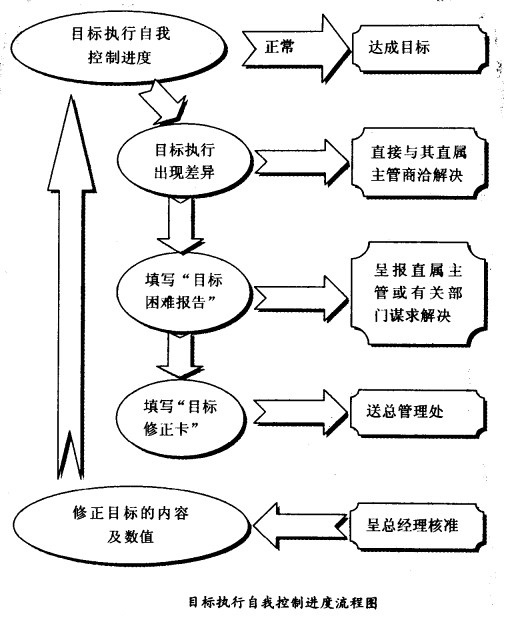 在目標(biāo)管理推行過程中,目標(biāo)的執(zhí)行是以會(huì)計(jì)年度起止為時(shí)限的,每年可分為上下兩期實(shí)施。各級(jí)目標(biāo)的執(zhí)行人應(yīng)根據(jù)目標(biāo)管理工作卡所訂項(xiàng)目自行負(fù)責(zé)推行,并自我控制進(jìn)度,若出現(xiàn)落后情形或差異,應(yīng)及時(shí)自行檢討并采取相應(yīng)改進(jìn)措施。