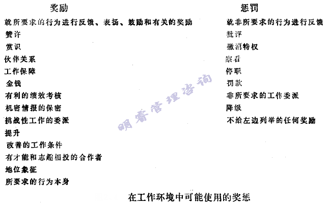 1.選用適當的獎勵或懲罰。激勵的需要理論表明,獎勵應當同具體需要聯系起來,激勵人們就是采用對這個人有意義的獎勵。下圖列舉的各種獎勵對某一個人有極大的作用,這取決于在這個人身上哪些需要當時是積極的。大多數獎勵是與更高的需要有關的。列舉的幾種獎勵能引起自我實現的需要的興趣,包括挑戰(zhàn)性工作的委派,提升和有利的績效考核。要求獲得獎勵的行為本身指向改變行為的微妙的方面。它大體上意味著,“良好的工作就是它自己的獎勵”一個成為高效生產者(例如超過定額)可能發(fā)現,達到高水平目標的過程就是一種有獎勵的活動。