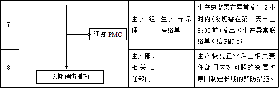 6. 對可能影響的生產(chǎn)進度,由生產(chǎn)經(jīng)理在異常發(fā)生2小時內(nèi)(夜班則在第二天早上8:30前)填寫《生產(chǎn)異常聯(lián)絡單》詳細向PMC部報告。