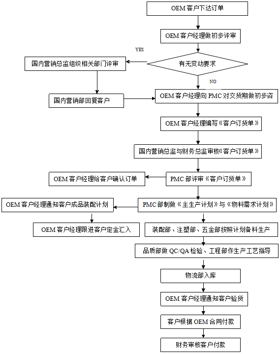 4.1 國內(nèi)營銷部接到客戶OEM訂單后,結(jié)合《OEM合作協(xié)議》審查訂單的單價(jià)、質(zhì)量要求、付款方式、交貨方式,符合則向PMC部初步咨詢能否滿足客戶訂單交期;不符合則組織相關(guān)部門進(jìn)行綜合評審,然后由PMC部確定訂單交期,OEM客戶經(jīng)理再和客戶協(xié)商更改訂單交期。