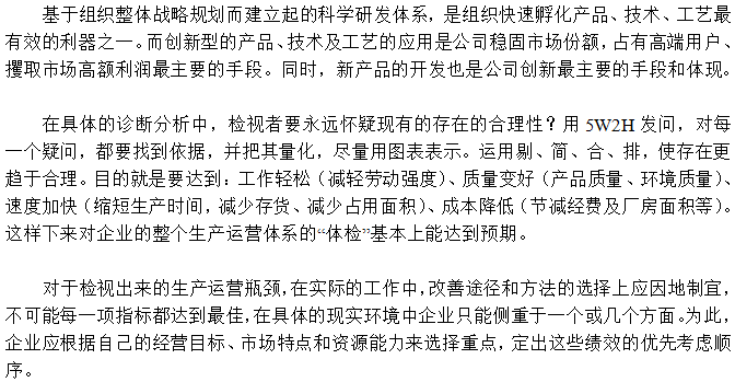 生產(chǎn)運營系統(tǒng)的優(yōu)劣直接影響到生產(chǎn)企業(yè)的效益,因此生產(chǎn)運營系統(tǒng)的診斷,找出系統(tǒng)的缺欠和不足并制定可行的實施方案是企業(yè)管理者或生產(chǎn)顧問專家的必修課。對于經(jīng)驗不夠豐富的管理者應從哪幾個方面對生產(chǎn)運營系統(tǒng)的全面診斷呢?