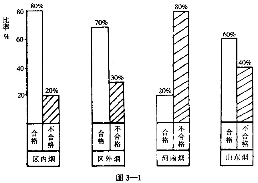每年7-8月至第二年的6月為一個煙葉收購年度,區(qū)內(nèi)煙一般在當(dāng)年11月就能收購?fù)戤叄既渴召徚康模常醋笥?。其余由區(qū)外或省外調(diào)撥來煙葉的時間不定,省外煙葉大半在次年上半年調(diào)人。由于區(qū)內(nèi)煙近幾年來實行了統(tǒng)一管理,工廠把質(zhì)量抓到改良煙葉品種、科學(xué)種植和初烤上,所以收購時質(zhì)量較好,降變級、霉變轉(zhuǎn)少,確保了企業(yè)大部分原料的質(zhì)量。目前煙葉質(zhì)量的主要矛盾在于區(qū)外和省外,尤其是省外,省外又以河南煙葉為最差,圖3-1為內(nèi)外煙葉質(zhì)量比較。