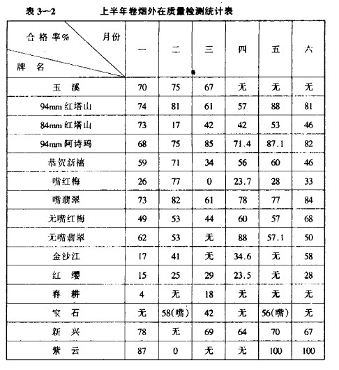 表3-1為1989年上半年各主要牌名卷煙外在質(zhì)量合格率分月統(tǒng)計表。從表中可以看出,被判為外在質(zhì)量不合格的卷煙批在總抽檢批中所占的比重是比較大的。