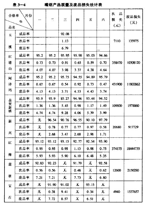 ?。保梗福鼓辏保对伦鞜煯a(chǎn)品質(zhì)量及廢品損失,參見表3-4。