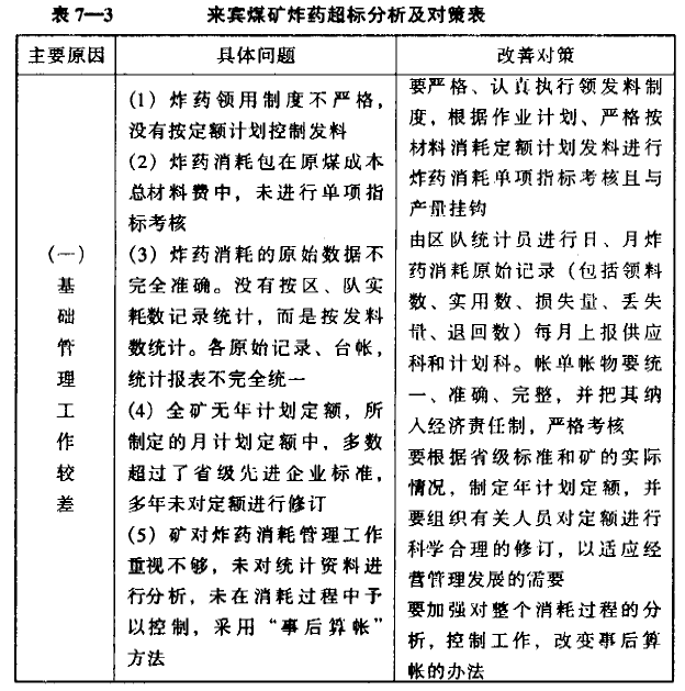 咨詢組通過對影響炸藥消耗主要影響因素的詳細分析,從狠抓內(nèi)部管理,挖掘內(nèi)部潛力人手,制定了降耗的措施方案,見來賓煤礦炸藥消耗超標(biāo)分析及對策表(表7-3)
