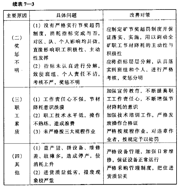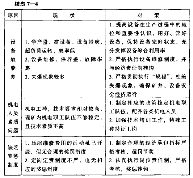 我省煤炭企業(yè)配件消耗的省級定額標(biāo)準(zhǔn)為1.0元/噸,來賓煤礦實際消耗值為1.01元/噸,超耗。雖然超耗幅度不大,但對全礦材料消耗達標(biāo),仍具較大影響。因此,咨詢組認真收集整理本礦的有關(guān)原始數(shù)據(jù)和資料,進行了認真分析。通過分析,咨詢組認為,造成本礦配件消耗高的主要因素有兩個方面。一是財務(wù)部門在對配件消耗費用的劃分上不夠準(zhǔn)確;二是全礦機電設(shè)備管理工作尚有差距。據(jù)此,咨詢組提出以下改善建議:(1)礦財務(wù)部門要嚴(yán)格按照國家和上級主管部門規(guī)定,進行礦山配件消耗的統(tǒng)計和費用分?jǐn)?,以期分?jǐn)傎M用盡量合理、準(zhǔn)確。(2)切實加強全礦機電設(shè)備管理工作,保證設(shè)備正常安全運行,減少設(shè)備磨損和故障,降低配件消耗。在對本礦機電設(shè)備管理工作進行詳細調(diào)查、分析的基礎(chǔ)上,提出了改善本礦機電設(shè)備管理工作的建議方案,供礦山在進行整改工作時參照執(zhí)行(參見表7-4)