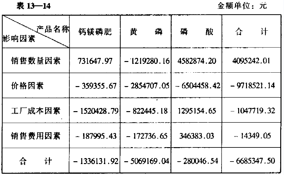 280046.54(元)三種產(chǎn)品按影響因素綜合整理如表13-14:
