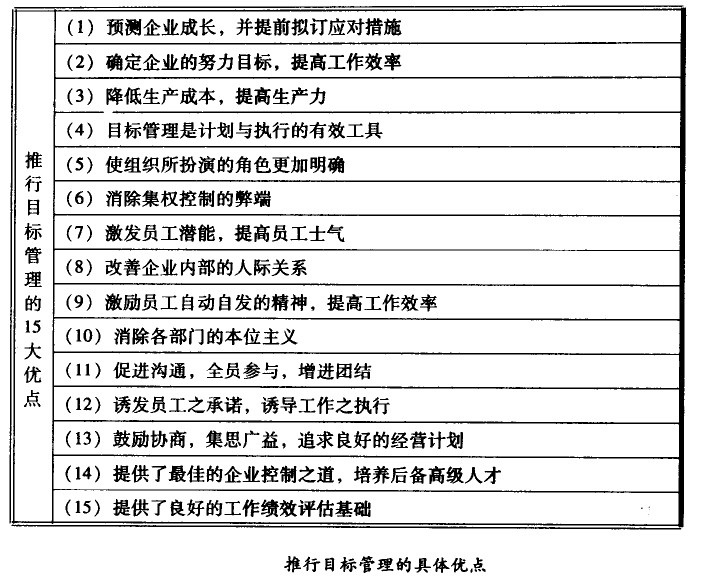 與傳統(tǒng)的企業(yè)經(jīng)營方法相比,改進(jìn)經(jīng)營管理的方式是目標(biāo)管理景突出的憂點。如果沒有目標(biāo)或沒有成果導(dǎo)向的計劃,就無法建立可以評價及可行動的方案,因此目標(biāo)管理強迫經(jīng)營者必須設(shè)法計劃出準(zhǔn)備取得的成果,而不僅僅限于行動或工作。經(jīng)營者除了必須考慮如何去完成成果以及所需的資源或成員外,甚至所需的部門間協(xié)助以及應(yīng)予控制納要點均應(yīng)考慮在內(nèi),以保證目標(biāo)的實現(xiàn)。推行目標(biāo)管理的具體優(yōu)點如圖所示: