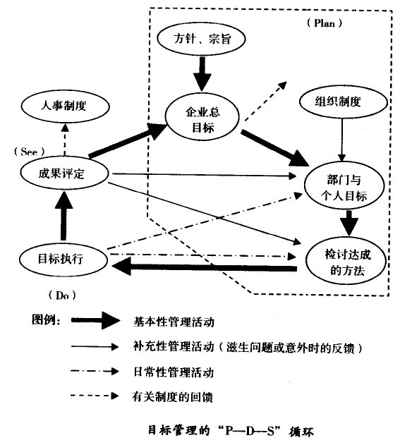 成果評價(see),分析實施后的績效。之后再將績效分析檢討修正,進(jìn)行重新規(guī)劃,由此進(jìn)入第二次“P—D一S”循環(huán)。目標(biāo)管理同樣受此“P—D-S”循環(huán)的支配。