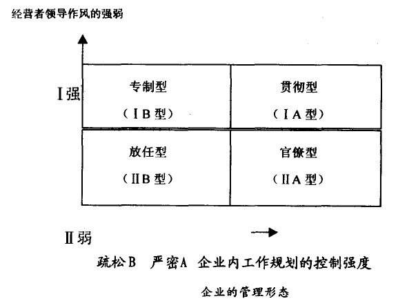 依照經(jīng)營(yíng)者的領(lǐng)導(dǎo)作風(fēng)和企業(yè)工作規(guī)劃這兩個(gè)指標(biāo),可以把企業(yè)的管理形態(tài)劃分為以下四類:貫徹型、專制型、官僚型、放任型。