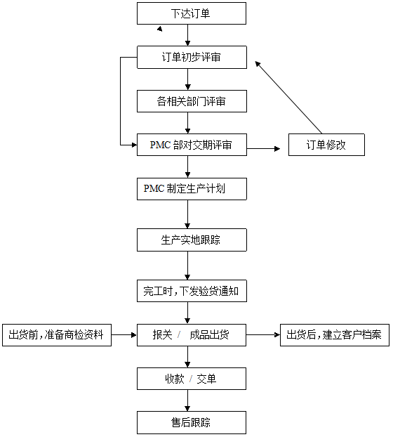 4.2 訂單修改:若有訂單需要修改的情況產(chǎn)生,無論是什么原因產(chǎn)生此修改,國外營銷部業(yè)務(wù)員都需要與客戶溝通聯(lián)系,清楚確認(rèn),以達(dá)成共識(shí)。訂單修改后需重新下發(fā)到PMC部,在原訂單的基礎(chǔ)上進(jìn)行評(píng)審。再由PMC部以書面形式通知相關(guān)部門。